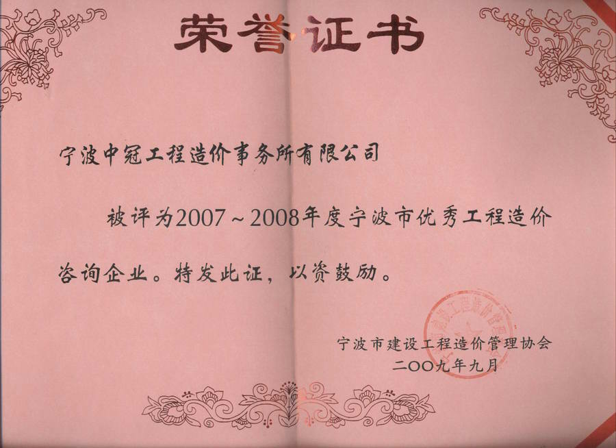 2007-2008年度寧波市優秀工程造價咨詢企業榮譽證書-中冠榮譽-中冠咨詢-中冠工程管理咨詢有限公司