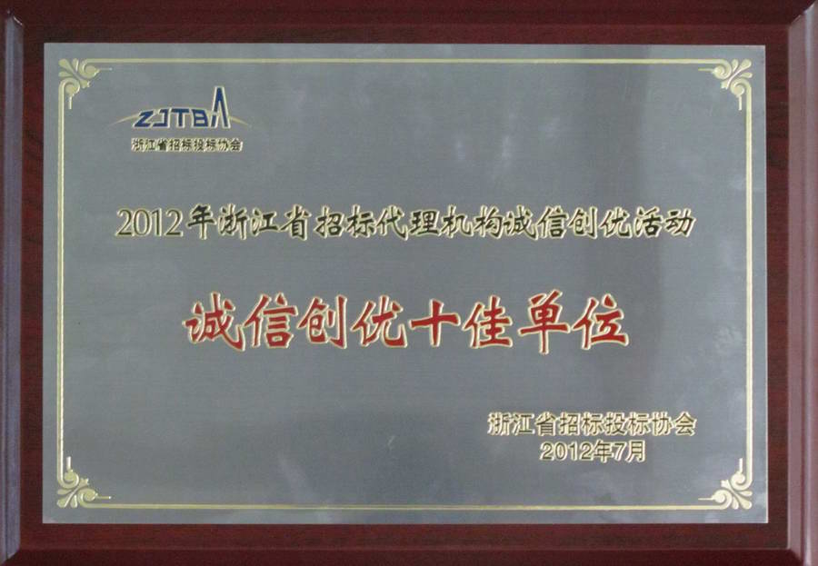 2012年浙江省招標代理機構“誠信創優十佳單位”