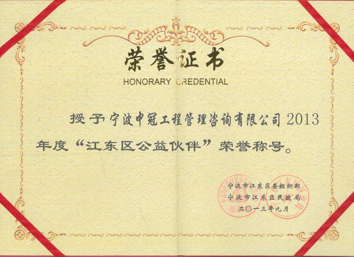 2013年度“江東公益伙伴”榮譽稱號-中冠榮譽-中冠咨詢-中冠工程管理咨詢有限公司