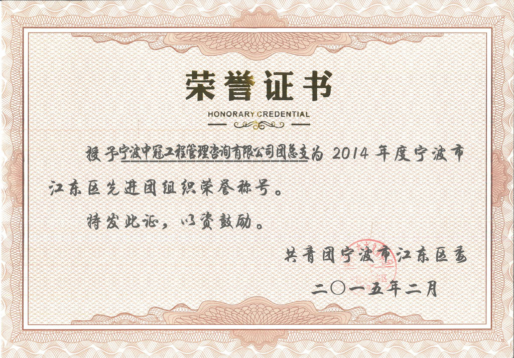 2014年度寧波市江東區先進團組織榮譽稱號-中冠榮譽-中冠咨詢-中冠工程管理咨詢有限公司