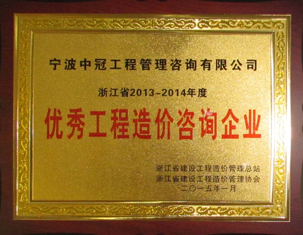 浙江省2013-2014年度優秀工程造價咨詢企業-中冠榮譽-中冠咨詢-中冠工程管理咨詢有限公司