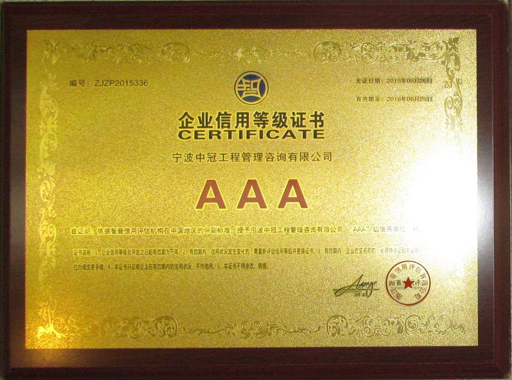 企業信用等級證書AAA-中冠榮譽-中冠咨詢-中冠工程管理咨詢有限公司