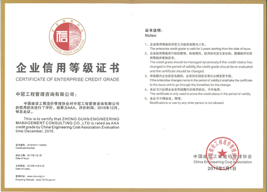 “中國建設工程造價管理協會企業信用評價AAA級信用企業”榮譽稱號-中冠榮譽-中冠咨詢-中冠工程管理咨詢有限公司